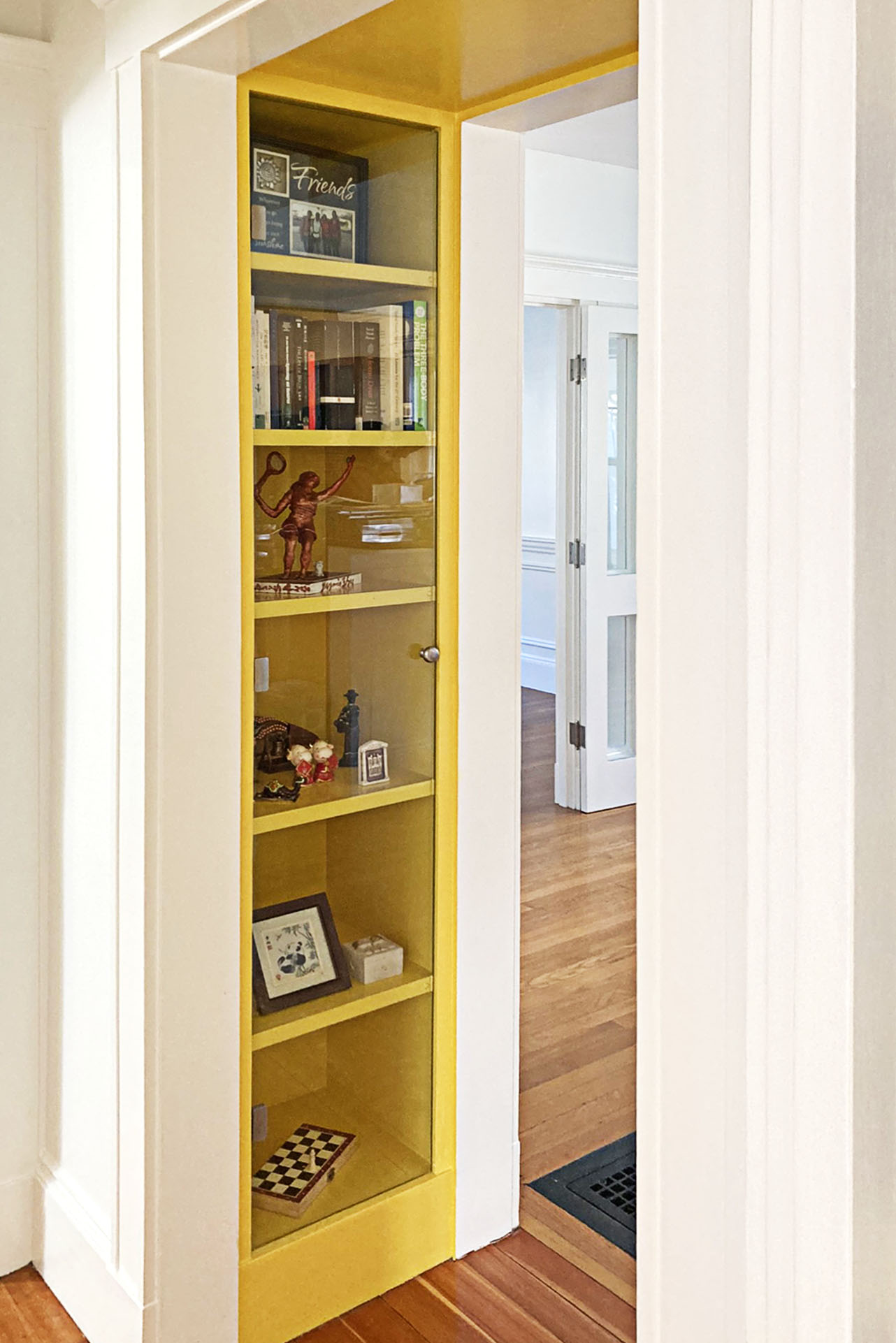 The Threshold Doorway is a design project that was commissioned by a private client who recently acquired a new condo in Longwood, Massachusetts. The client expressed their desire to enhance the existing space with subtle interventions. During our exploration of the space, we identified the doorway leading from the dining room to the bedrooms as an intriguing element. Despite its narrow width, the doorway has built-in cabinets along one side wall. In order to highlight this unique feature, we decided to paint the entirety of the doorway with Benjamin Moore Sunray #343, a "sunkissed" hue that exudes a bold and cheerful energy, as defined by the official Benjamin Moore color palette. The resulting effect of this design decision is a special threshold that illuminates the connection between the spaces and imbues a sense of lightness to the entire room.
